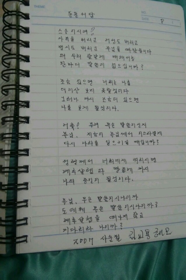 동문서답 스승이시여! 가족을 버리고 어선도 버리고 쟁기도 버리고 주님을 따랐습니다. 왜 우리 앞날에 대해서는 한 마디 말씀이 없으십니까? 조금 있으면 너희는 나를 더 이상 보지 못할 것이다. 그러나 다시 조금 더 있으면 나를 보게 될 것이다. 어휴! 주여 무슨 말씀이신지 주님, 지금이 주님께서 이스라엘에 다시 나라를 일으키실 때입니까? 성령께서 너희에게 내리시면 예루살렘과 땅 끝에까지 나의 증인이 될 것이다. 주님, 무슨 말씀이시나이까 도대체 무슨 말씀이시나이까? 예루살렘을 떠나지 않고 기다리라 나이까? 2007 사순절 김교용 레오 ----------------------------------------------------------------- 이 시는 저희 아버지 김교용(레오)님께서 인터넷에 올려달라고 부탁하셔서 딸인 제가 올립니다. 이 시의 저자는 김교용(레오)님이십니다. |