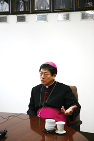 - 어제 뉴스에 보니 25년 만에 50대 대주교가 났다고 보도하더군요. 저는 주교님들 중에서 늦게 주교가 된 사람으로 나이도 비교적 젊은 편인 50대 후반입니다. 현재 우리 관구에 5개 교구(대구, 부산, 청주, 마산, 안동)가 있고 저는 관구장 역할도 해야 합니다. 5개 교구 주교님 가운데 가장 늦게 주교가 된 교구장이지만, 이는 나이가 많고 적음의 문제가 아니고, 서로 협력관계를 가지고 가톨릭교회 정신으로 함께 한다면 큰 문제가 없다고 생각합니다. 부족함이 많기 때문에 다른 주교님들의 협조 안에서 차근차근 해 나갈 생각입니다.